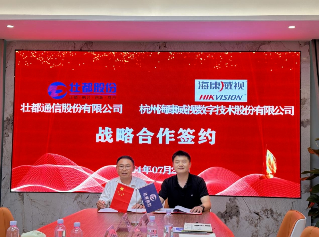 2024年7月24日下午,壮都股份与海康威视在广西南宁壮都集团总部举行战略合作协议签约仪式。壮都股份董事长蒋满州和海康威视广西业务中心总裁袁海涛代表双方签约。