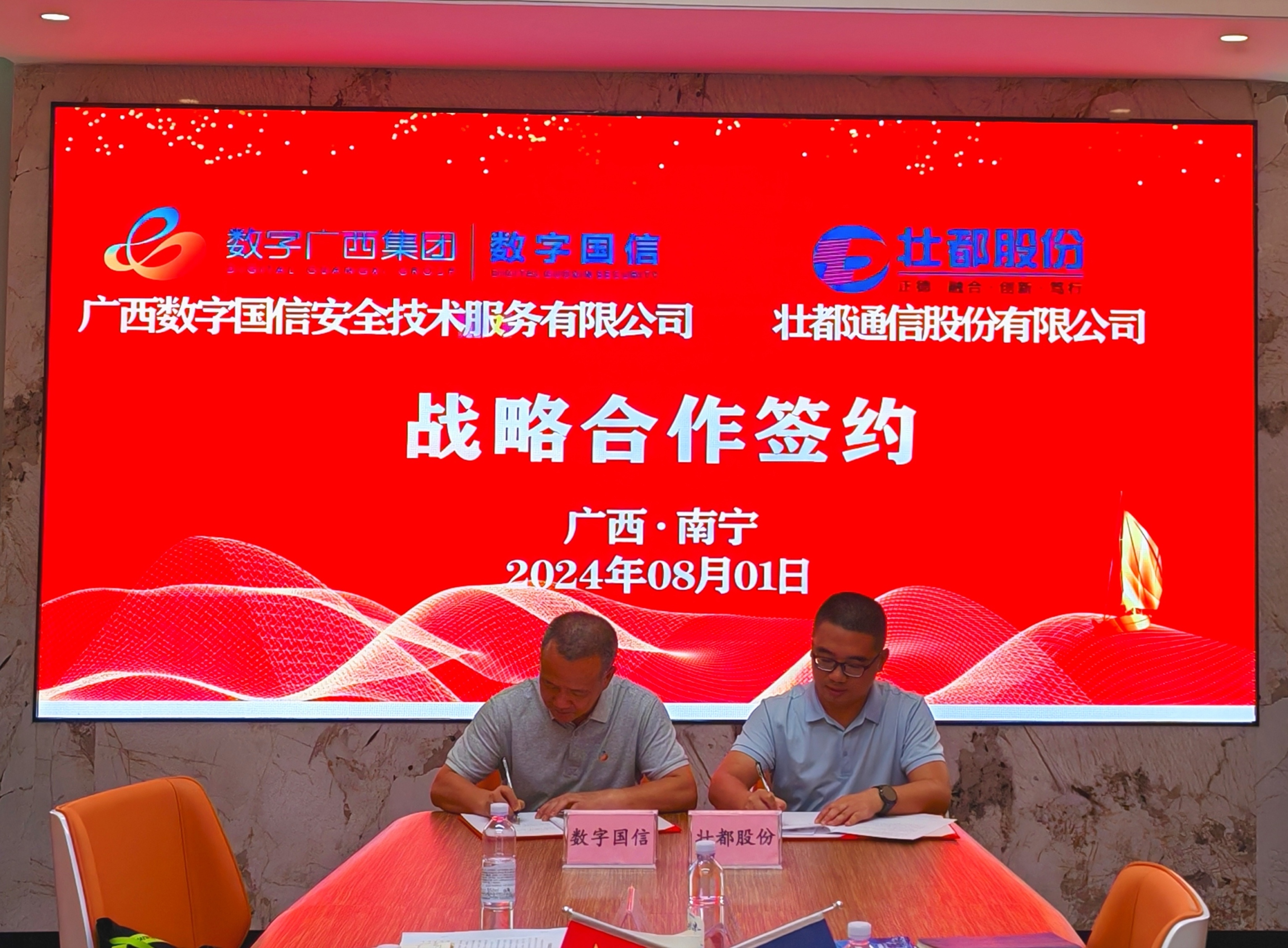 8月1日上午,壮都股份与数字广西集团数字国信安全技术公司在集团总部举行战略合作协议签约仪式。壮都股份总经理唐铃和数字国信总经理吴显文代表双方签约。