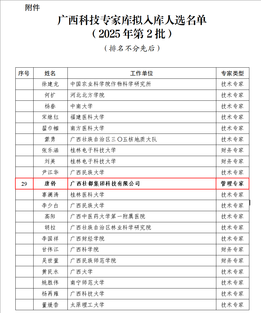 近日,自治区科技厅发布2025年《广西科技专家库拟入库人选名单》,壮都集团唐铃同志成功入选。此次入选是自治区科技厅对唐铃同志专业能力的高度认可,更是一份服务广西科技发展的责任担当。
